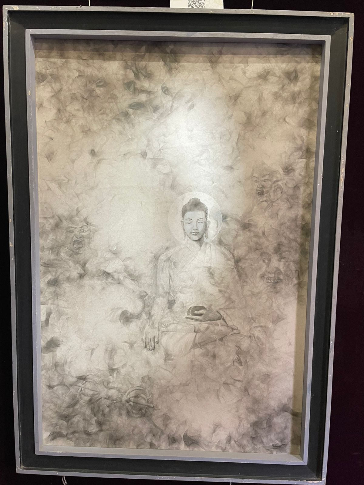 Smoke—ephemeral, formless, and transient—becomes both medium and metaphor. The Buddha emerges not through permanence but through residue, echoing Buddhist teachings on impermanence, detachment, and the fleeting nature of existence. The artwork exists as a trace of breath and time, embodying the paradox of stillness born from motion and form arising from the formless.
